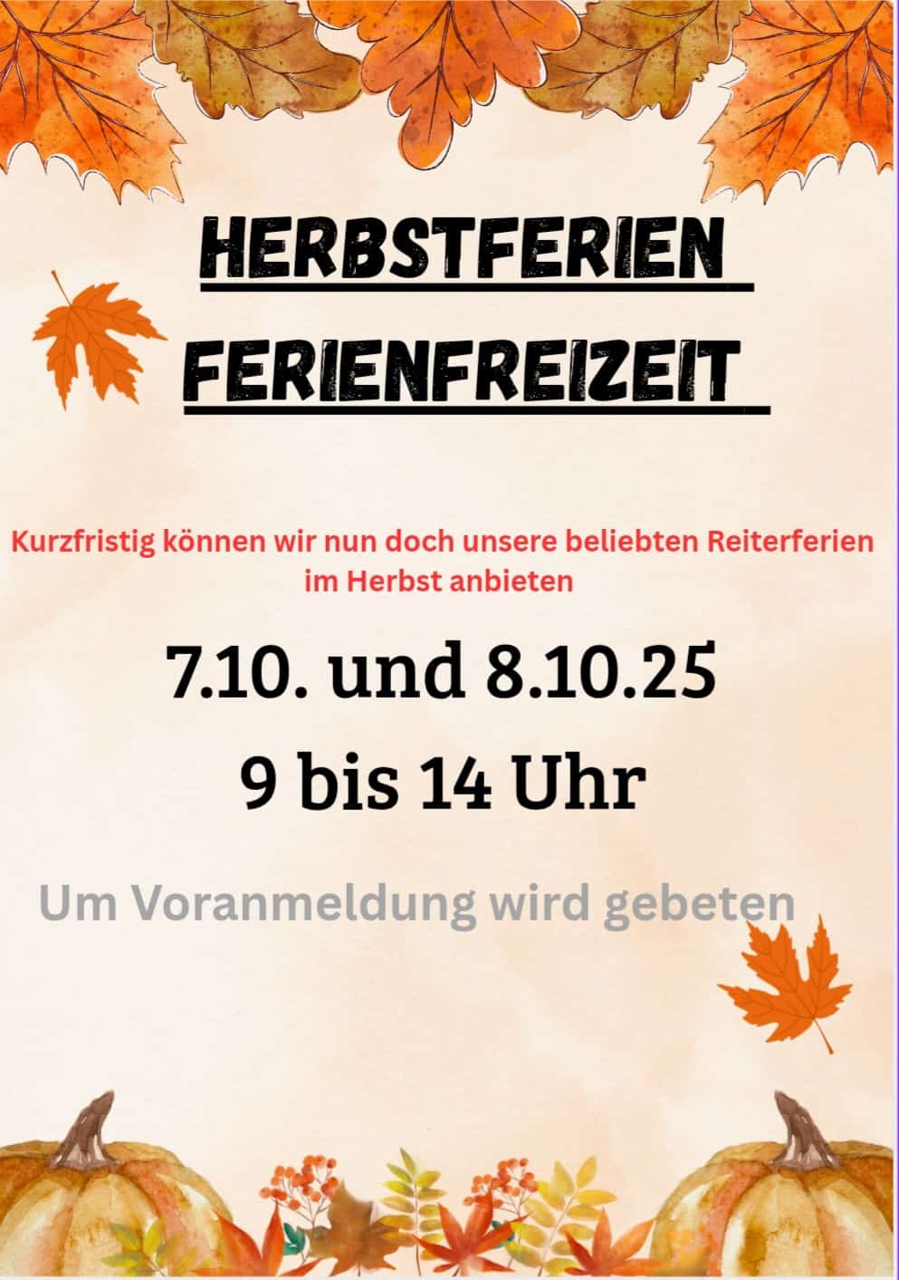 Wir planen in den Herbstferien wieder eine Ferienfreizeit auf dem Reiterhof vom 27.10.-31.10.2014. In der Zeit von 9-13 Uhr steht natürlich wieder das Reiten und die Pferdepflege im Vordergrund und ihr lernt allerhand rund um das Pferd. Nebenbei wird noch gebastelt und gemalt und zum Abschluss steht eine kleine Kutschfahrt an. Anmeldungen werden telefonisch, per E Mail über unser Anmeldeformular oder per Anfrage in unserem Kontaktformular angenommen. Der Preis für die ganze Woche beträgt 125 Euro.